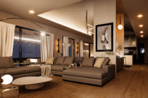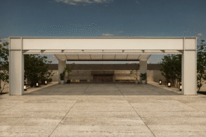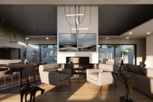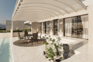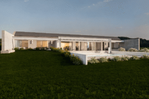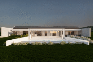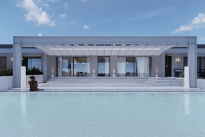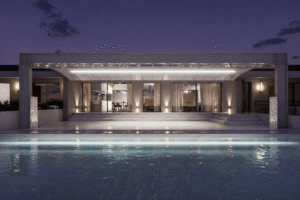 La vida interior se organiza con claridad: el ámbito social como una gran nave continua que gira en torno a una chimenea central, símbolo y punto de encuentro; las alas laterales acogen los dormitorios, el estudio y los espacios de servicio, trazando un equilibrio entre intimidad y convivencia. La secuencia espacial no se detiene en los límites de la planta: se expande bajo un porche profundo, se prolonga en el patio principal y alcanza su culminación en la lámina de agua, el solárium y las estancias exteriores.