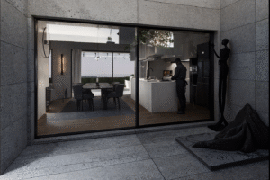 Entre las colinas suaves que miran al Cantábrico, la vivienda, situada en Santander se implanta como un trazo preciso, reconocible en su orden axial y en la forma en que deja que la pendiente del terreno modele la experiencia de llegada. No se arriba de golpe: primero un umbral generoso para el automóvil, luego un descenso pausado hacia un patio íntimo, donde el visitante descubre la escala doméstica y la medida exacta de la privacidad. Ese gesto, mínimo y contundente, permite que la vivienda se enraíce en el suelo y se resguarde del exterior, entregando una fachada contenida y silenciosa hacia la calle, mientras que su verdadera vocación se revela al norte, donde todo se abre en transparencia hacia el horizonte y el mar.